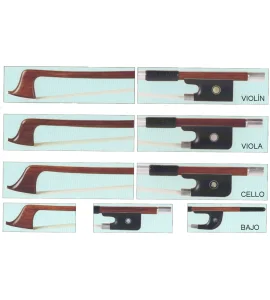 Arcos chinos de mejor calidad, vara redonda EN PERNAMBUCO económico, talón de ébano con ojo parís montado en plata para viola y cello, punta de material sintético, cerdal natural. Para violín el talón es de flor de LIS