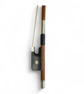 Arco de Pernambuco, vara redonda o octagonal, talón de ébano montado en plata con ojo parís, guarnición de plata, punta de hueso, cerdal natural, estampado Anton Wolf